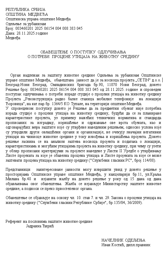Oбавештење о поступку одлучивања о потреби израде студије о процени утицаја на животну средину Пројекта „Реконструкција радио базне станица мобилне телефоније на локацији Ђоровица“